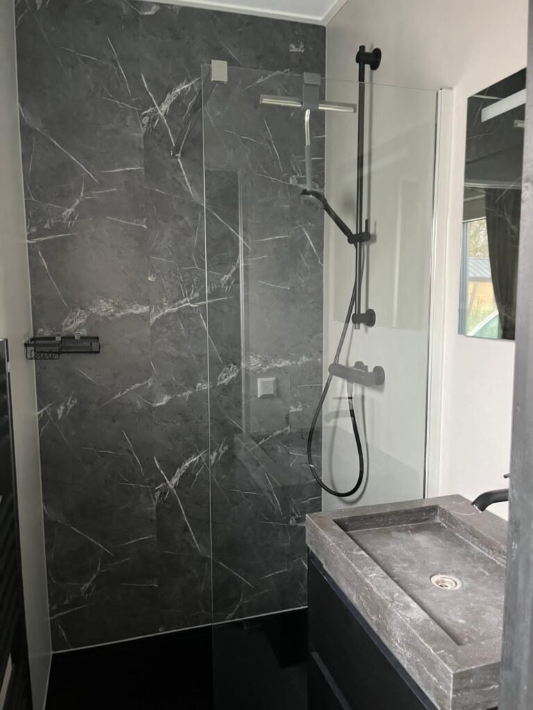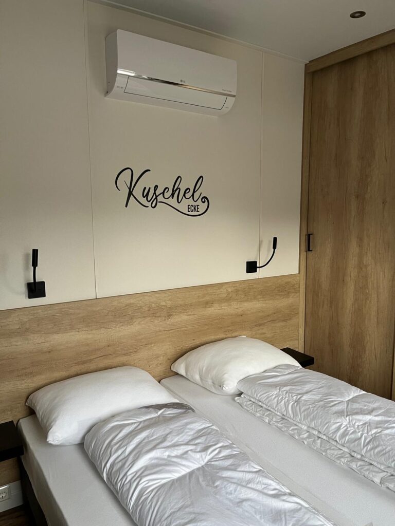 Zwei separate Schlafzimmer – beide mit eigenem Zugang zu einem modernen Bad – bieten ausreichend Privatsphäre für Familien oder befreundete Paare. Die Einzeltoilette sorgt zusätzlich für Komfort im Alltag. Und damit auch heiße Tage entspannt bleiben, ist das Chalet mit einer leistungsstarken Klimaanlage ausgestattet.