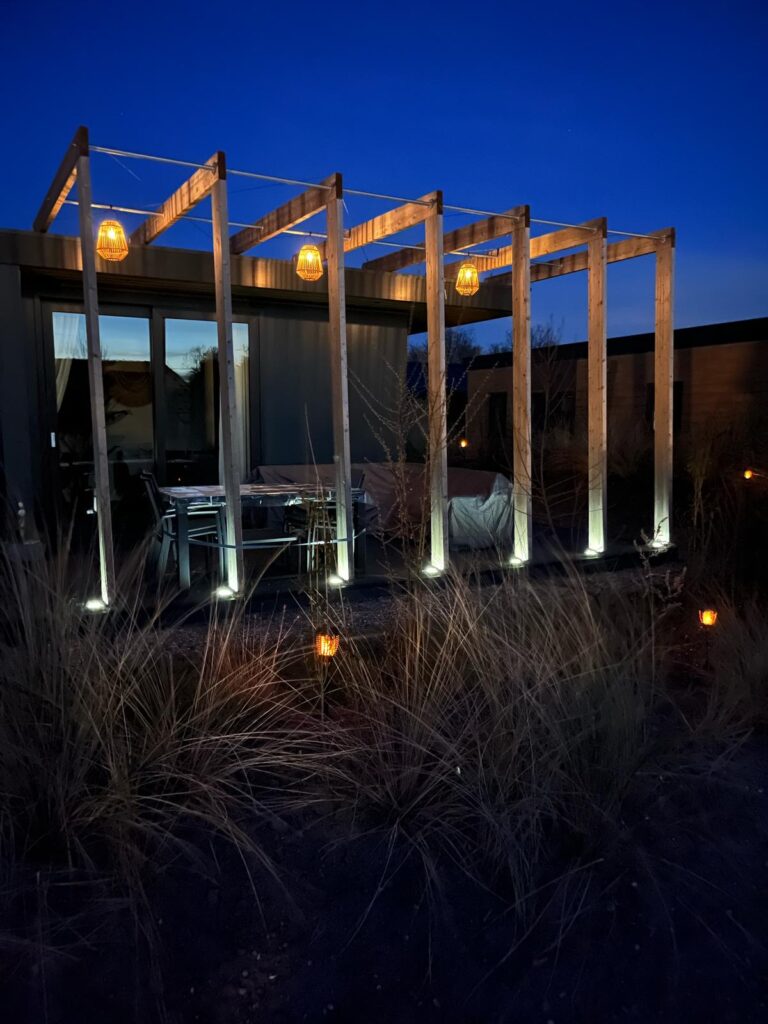 Ein echtes Highlight ist die große, teilweise überdachte Terrasse mit moderner Holzpergola und stilvoller Beleuchtung. Tagsüber ein ruhiger Ort für die erste Tasse Kaffee in der Sonne, abends stimmungsvoll beleuchtet für ein Glas Wein unter freiem Himmel. Der kleine Garten mit dekorativen Gräsern rundet das Urlaubsgefühl ab.